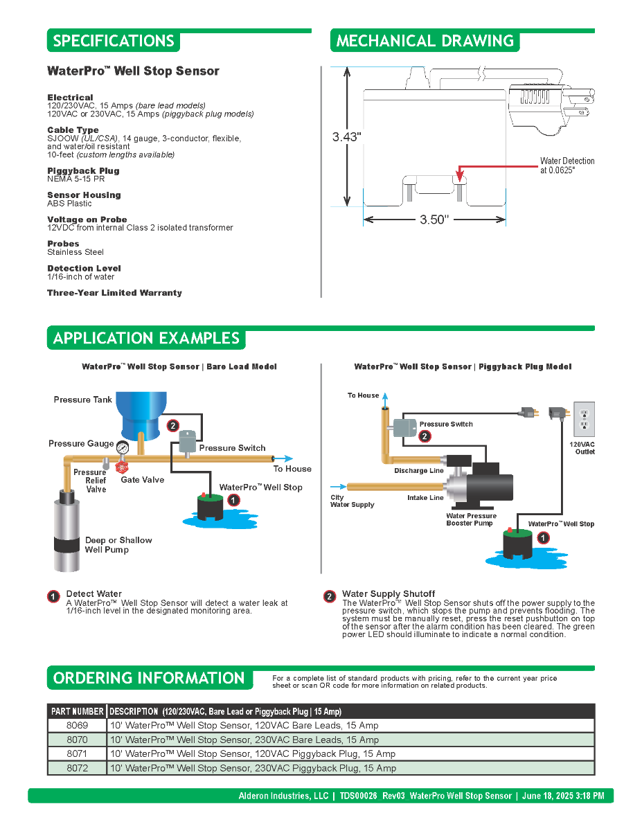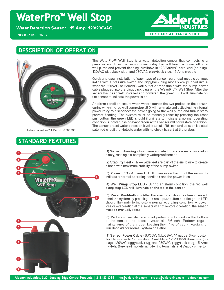 An alarm condition occurs when water touches the two probes on the sensor, during which the red well pump stop LED will illuminate and activates the internal power relay to disconnect the power going to the well pump and turn it off to prevent flooding. The system must be manually reset by pressing the reset pushbutton, the green LED should illuminate to indicate a normal operating condition. A power loss or evaporation at the sensor will not restore operation. The sensor preset water detection level is set at 1/16-inch and uses an isolated patented circuit that detects water with no shock hazard at the probes.