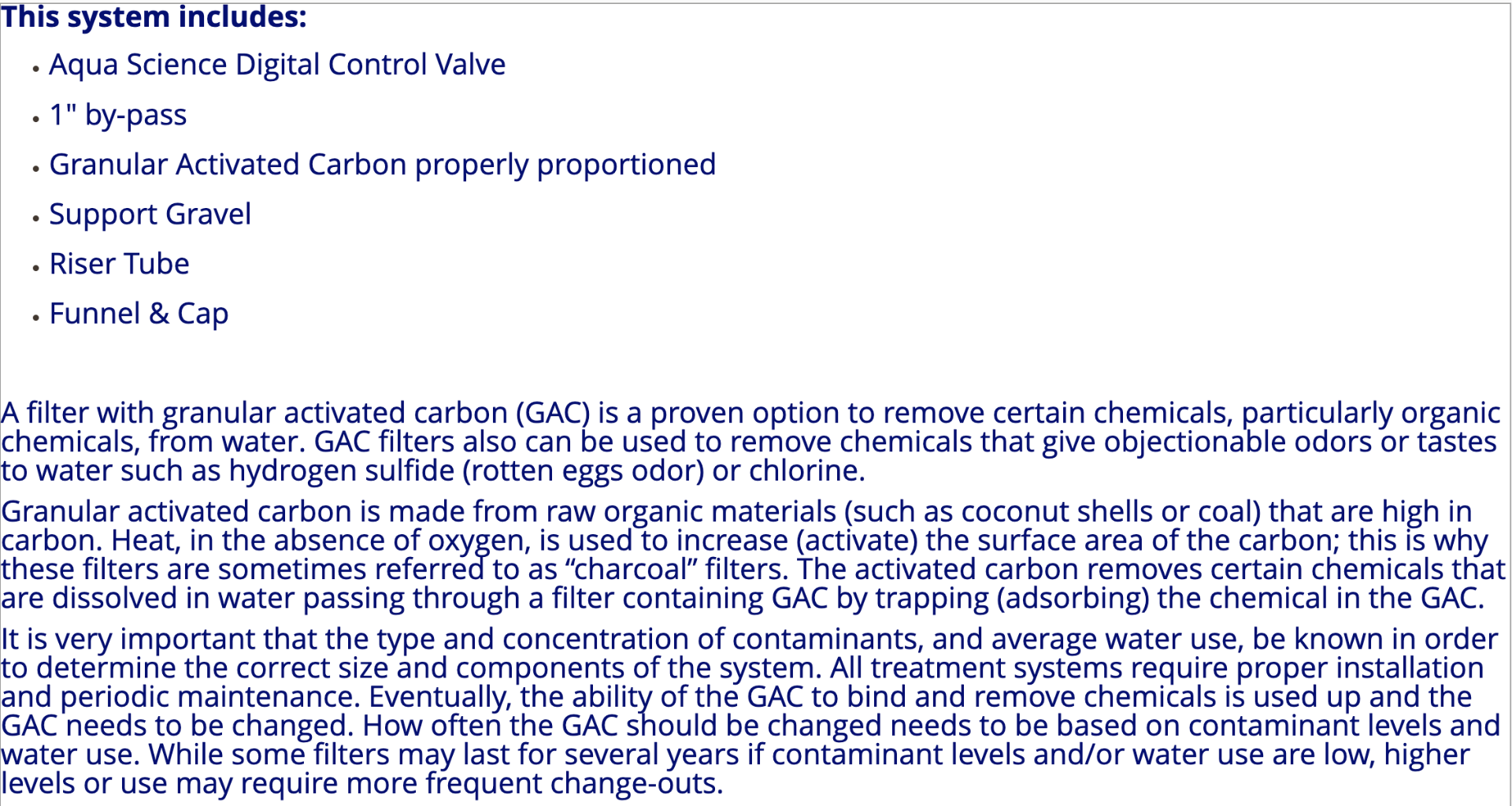 It is very important that the type and concentration of contaminants, and average water use, be known in order to determine the correct size and components of the system. All treatment systems require proper installation and periodic maintenance. Eventually, the ability of the GAC to bind and remove chemicals is used up and the GAC needs to be changed. How often the GAC should be changed needs to be based on contaminant levels and water use. While some filters may last for several years if contaminant levels and/or water use are low, higher levels or use may require more frequent change-outs.